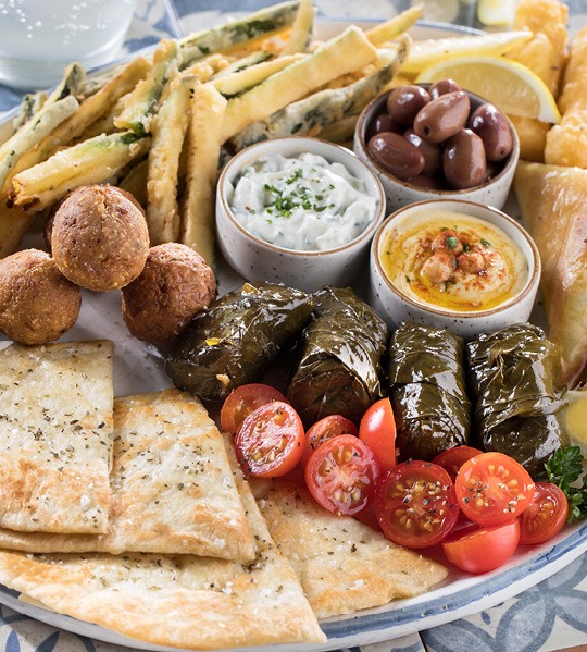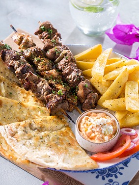 Our selection of meze is a popular favourite, together with our souvlaki, either plated (choices of skewered meat), or served as a yiro, (your choice of meat in a home-made pita bread lightly drizzled with olive oil, origanum and coarse salt). We also have deliciously coal-grilled and oven-roasted mains, served with a variety of dips, fresh traditional salads and sides.